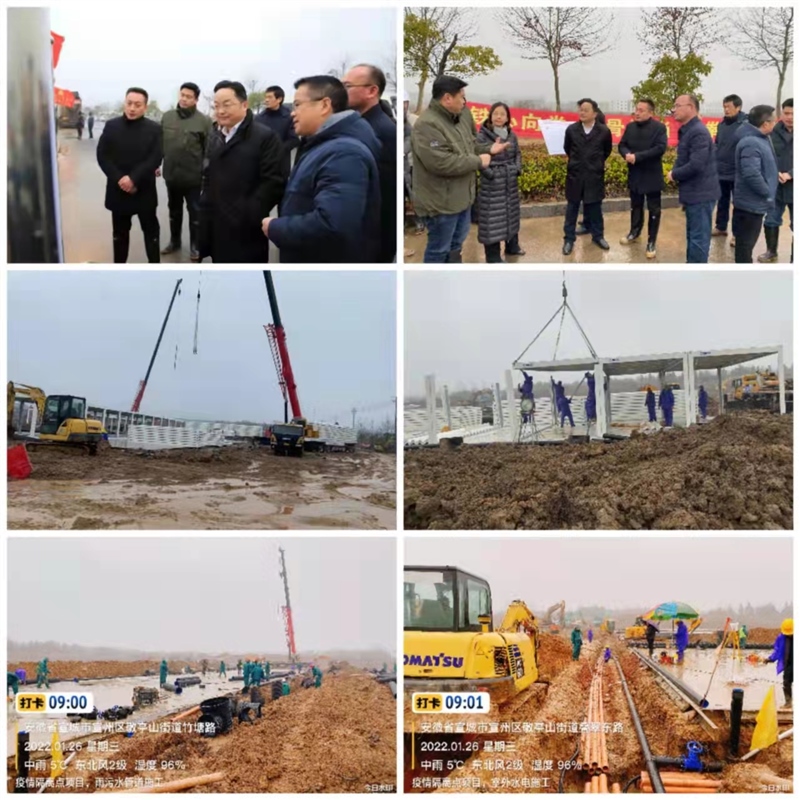 截止1月26日,現場已完成10000平方米混凝土硬化,雨污水管道、室外水電管道安裝進展迅速,集裝箱板房開始拼裝。天氣惡劣、工期緊迫,一線人員努力克服各種困難和障礙,迎難而上。1月25日下午,區政府召開宣州區新冠肺炎疫情防控工作專題會議,審定了隔離點項目方案,明確了相關事項,會議對施工進度和現場管理給予了充分的肯定,同時也要求在嚴把工程質量關和隔離點各項要求的基礎上,倒排工期,加快施工,確保早日交付使用。