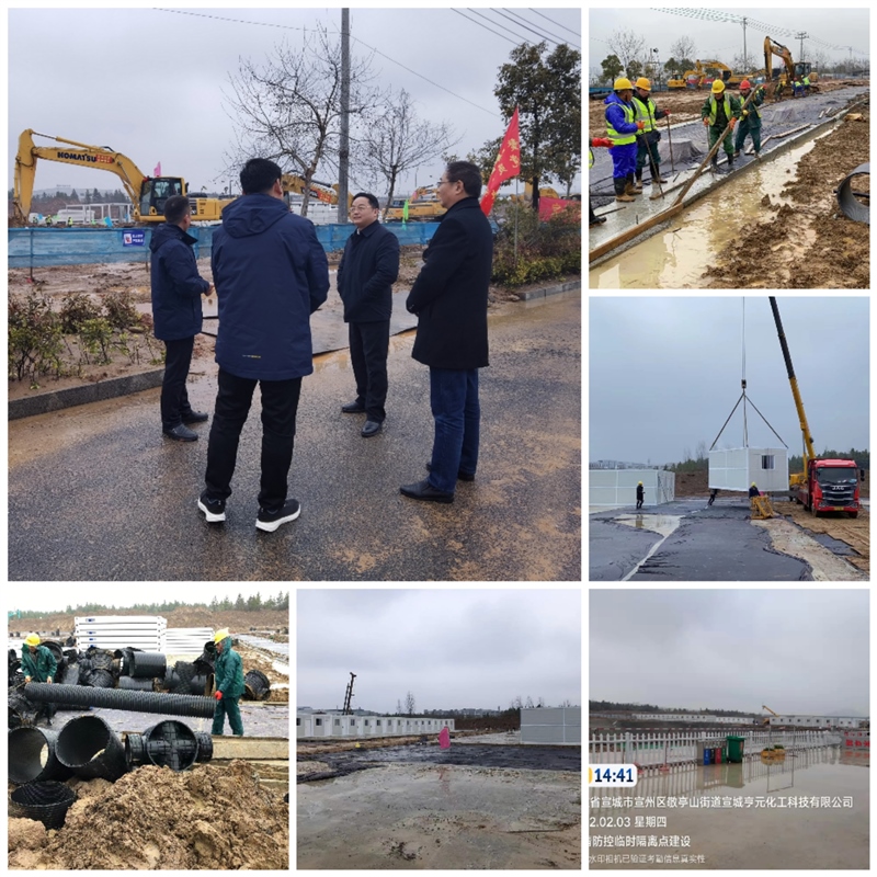 正月初三上午,區委副書記、區長俞志剛到宣州區疫情防控臨時隔離點工地現場督導項目建設,副區長汪海洋陪同。俞志剛對項目建設速度給予充分肯定,向春節期間冒著雨雪天氣加班加點的項目建設者表示親切的慰問。上午,現場工人正在對路面沉降縫進行切割、對積水較多區域進行排水,為下一步吊裝工作做好準備。截止目前,臨時隔離點北邊庫房、醫護辦公、醫護宿舍合計36套已吊裝結束,即將完成22套準備區用房吊裝工作。