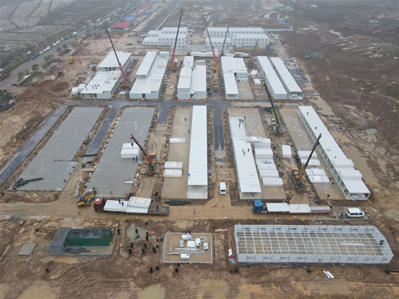 2月10日,農(nóng)歷正月初十,大雪過后,地面泥濘。隔離區(qū)項目現(xiàn)場管理人員及施工人員精神抖擻、有條不紊地開展施工作業(yè),持續(xù)推進打包房、折疊房和板房的安裝,水電配套同步進行。