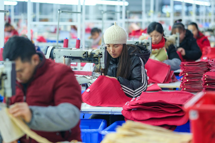 2024年1月18日,社區居民在紅安社區的鄉村振興就業車間工作。紅安社區是由易地搬遷安置區單獨成立的新社區,