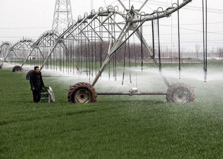 村民使用全自動指針式噴灌機進行澆灌作業。新華社發(程全攝)