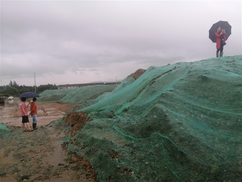 工作人員冒雨帶領(lǐng)客戶查看砂石資源處置現(xiàn)場(chǎng)